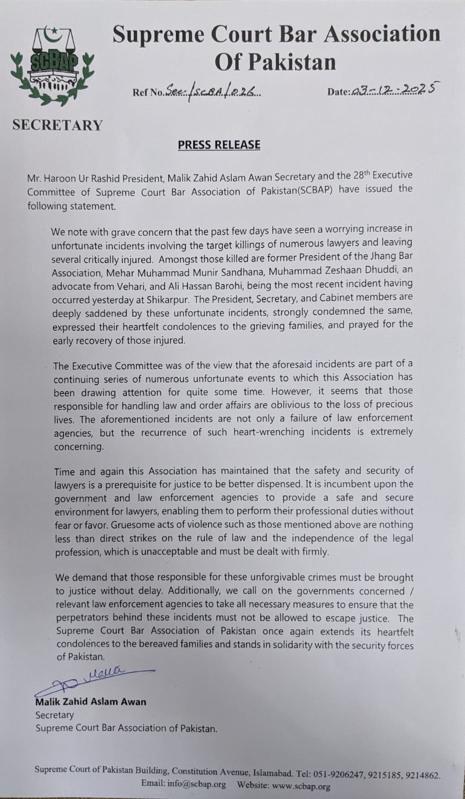 SCBAP Condemns Surge in Targeted Killings of Lawyers, Demands Immediate Action
